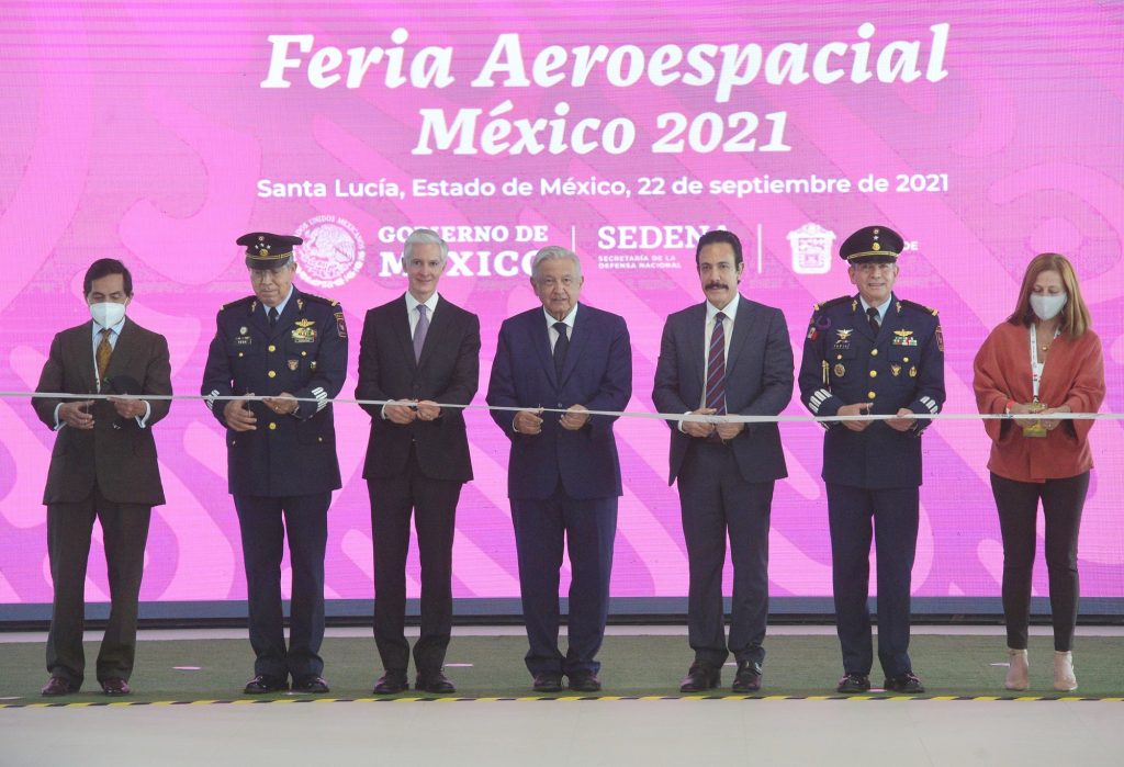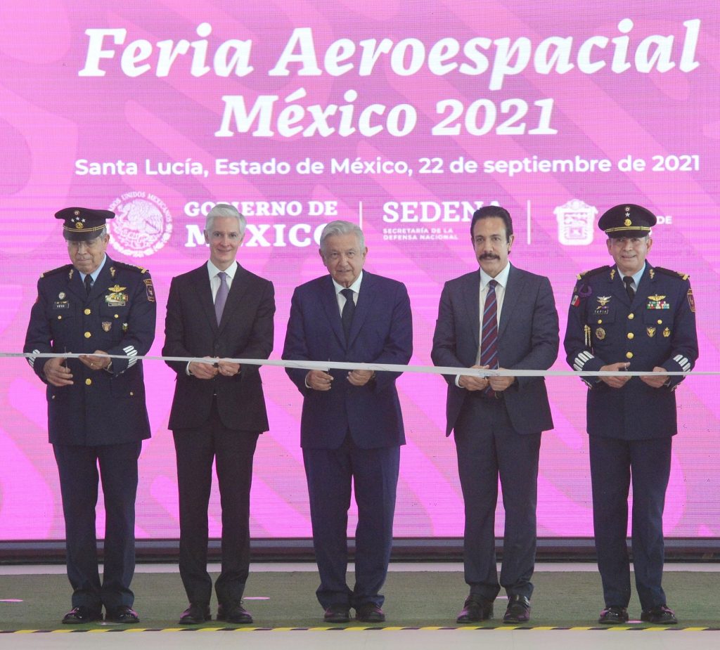 Tecámac, Estado de México, 22 de septiembre de 2021. El Gobernador Alfredo Del Mazo Maza acompañó al Presidente de México, Andrés Manuel López Obrador, a la Inauguración de la Feria Aeroespacial México 2021 (FAMEX 2021), que se desarrolla en la Base Aérea Militar No. 1, Santa Lucía.