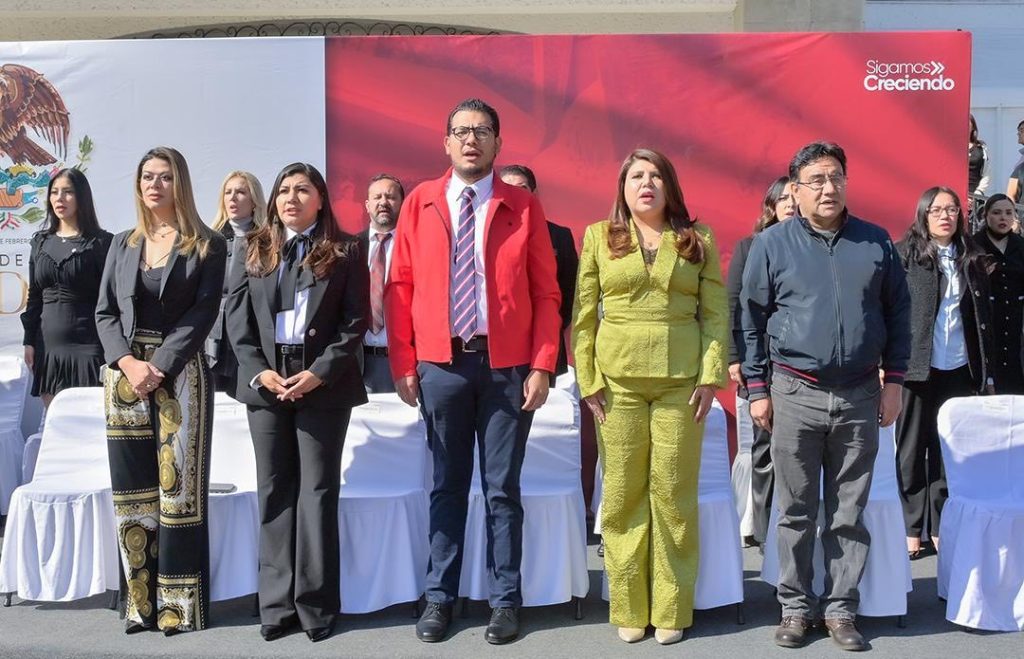 En la ceremonia conmemorativa por el Día de la Bandera, el Alcalde estuvo acompañado por la Presidenta Honoraria del Sistema Municipal DIF, Paty Arévalo, integrantes del Cabildo, directores de la administración y representantes del SUTEyM, quienes rindieron honor al símbolo que representa la historia, lucha y unidad del pueblo mexicano.
