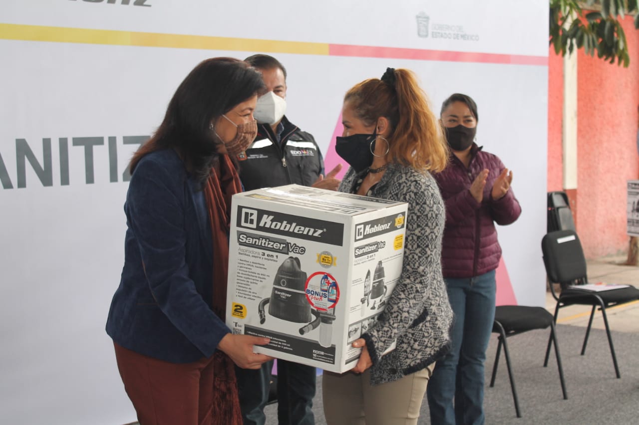 Teoloyucan, Estado de México, 22 de noviembre de 2021. La Secretaria del Trabajo, Martha Hilda González Calderón, encabezó la entrega de 196 aspiradoras sanitizantes por parte de la empresa Koblenz, a escuelas de nueve municipios del Valle de México.