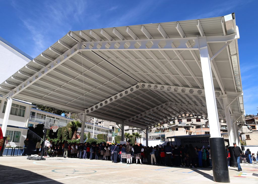 Huixquilucan, Estado de México, enero 23, 2024.- Los 600 alumnos de la Primaria “Emiliano Zapata”, ubicada en la comunidad de El Palacio, cuentan con mejores instalaciones, luego de que el Gobierno de Huixquilucan construyó una techumbre de 539.40 metros cuadrados de superficie, con la finalidad de que puedan realizar sus actividades escolares en óptimas condiciones, tales como la educación física y recreativas.