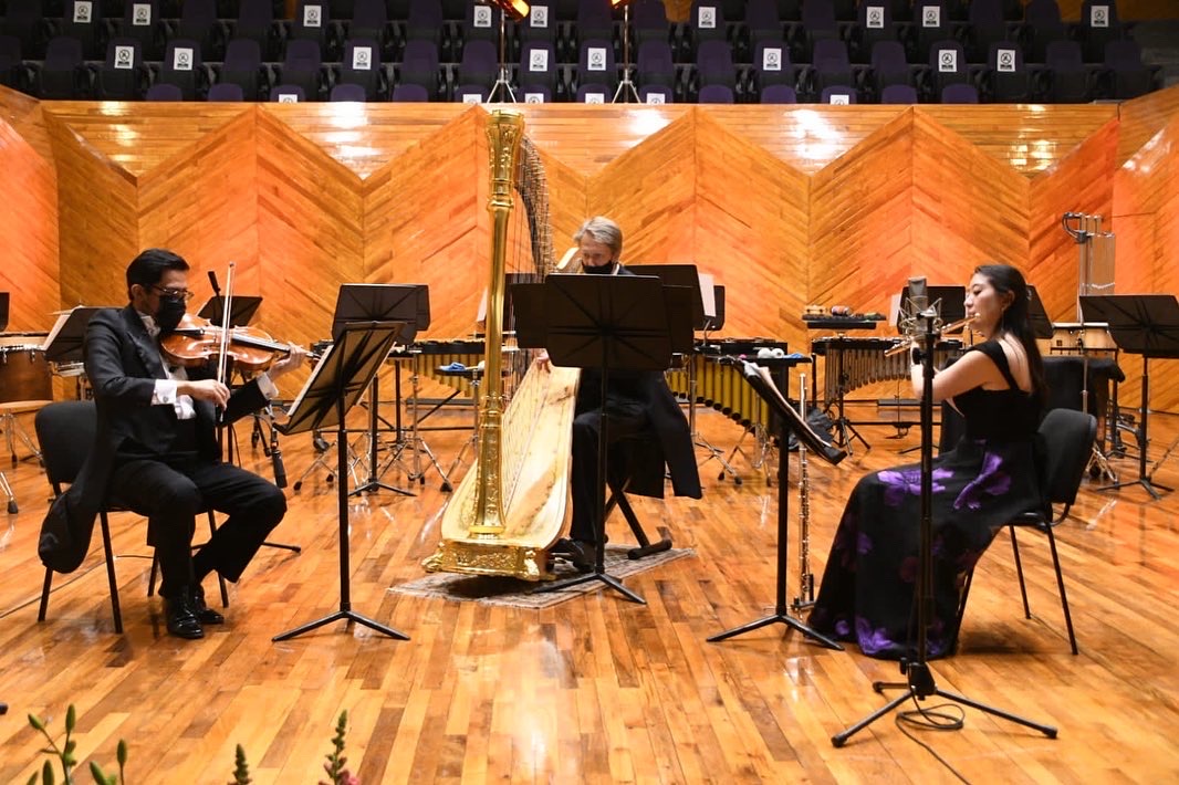 • Completa programa el ensamble de arpa, flauta y viola con obras de Claude Debussy y Eduardo Angulo.