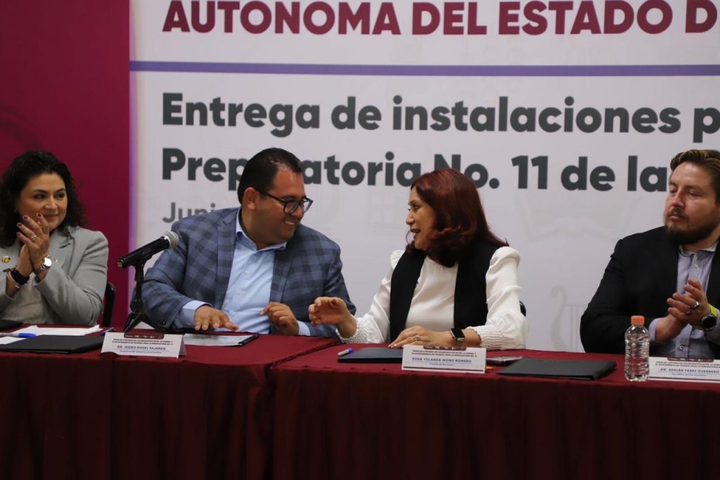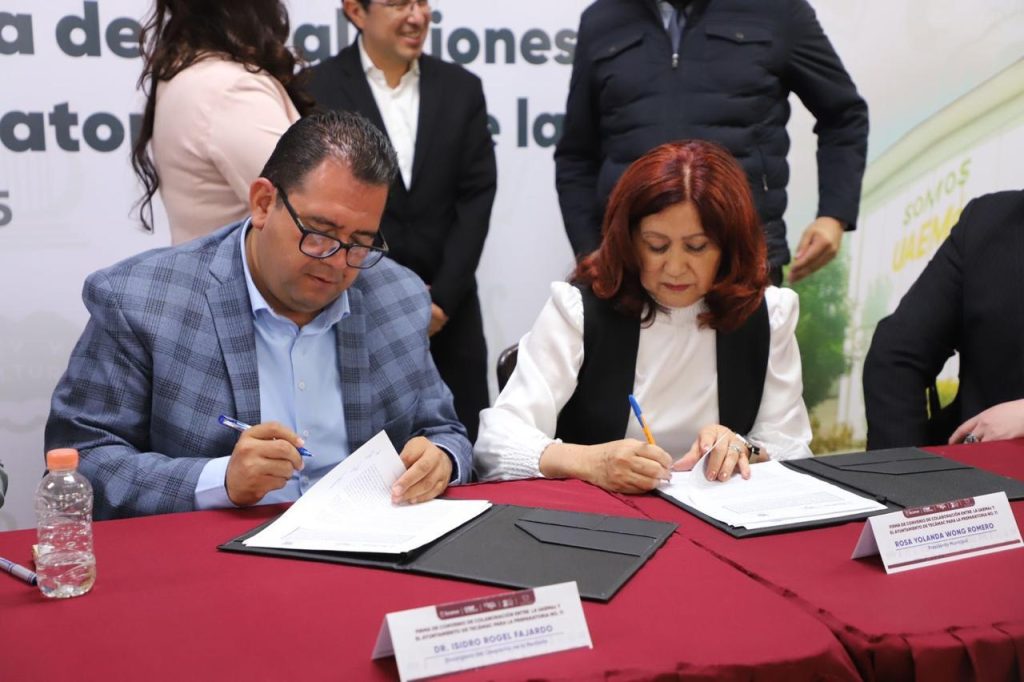 La presidenta municipal Rosi Wong Romero y el doctor Isidro Rogel Fajardo, encargado de la oficina de la Rectoría de la Universidad Autónoma del Estado de México (UAEMéx), firmaron el contrato de comodato mediante el cual se formaliza la entrega del inmueble que albergará a la Preparatoria No. 11 de dicha casa de estudios.