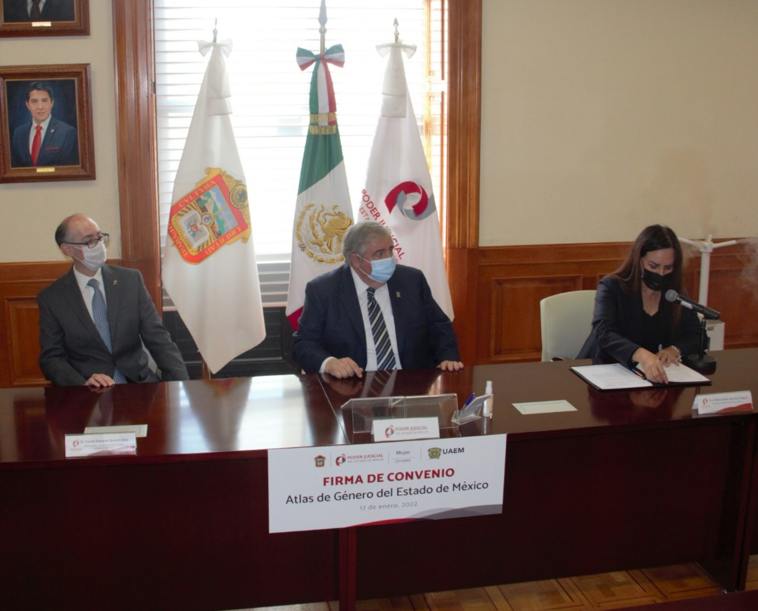 Toluca, Estado de México, 17 de enero de 2022. Con la finalidad de prevenir y atender problemas como discriminación, desigualdad y violencia de género, la Secretaría de la Mujer firmó un Convenio de Colaboración con el Poder Judicial del Estado de México (PJEM) y la Universidad Autónoma del Estado de México (UAEM).