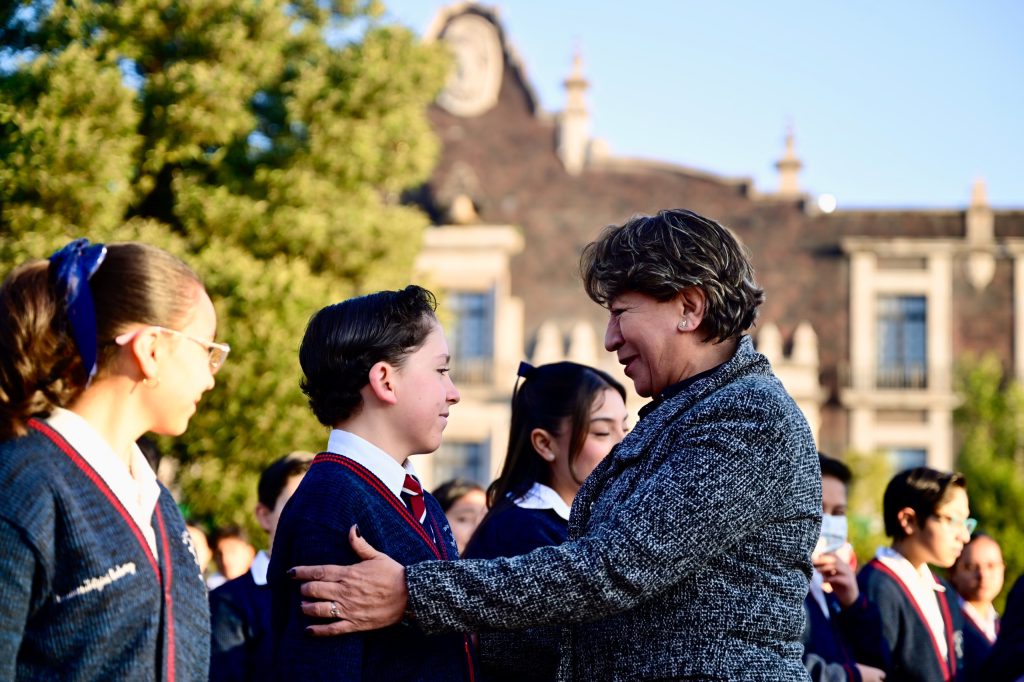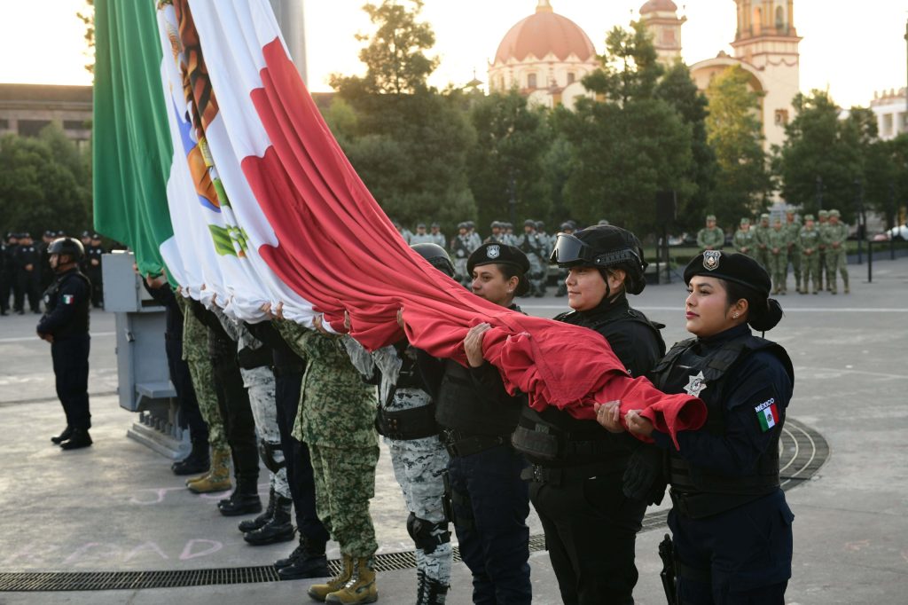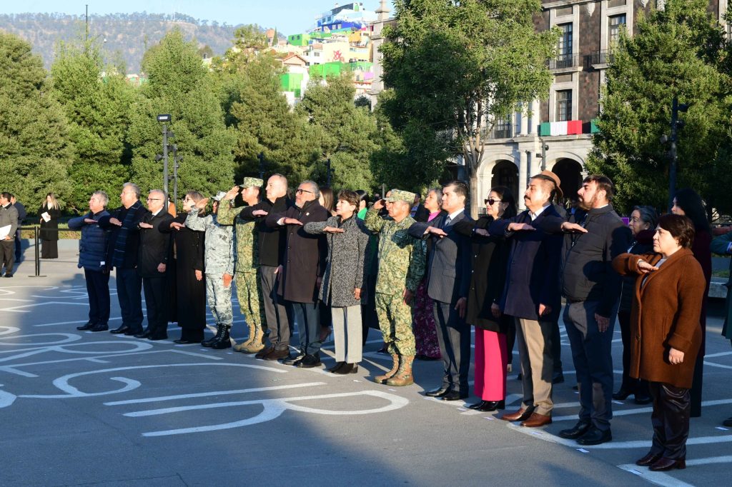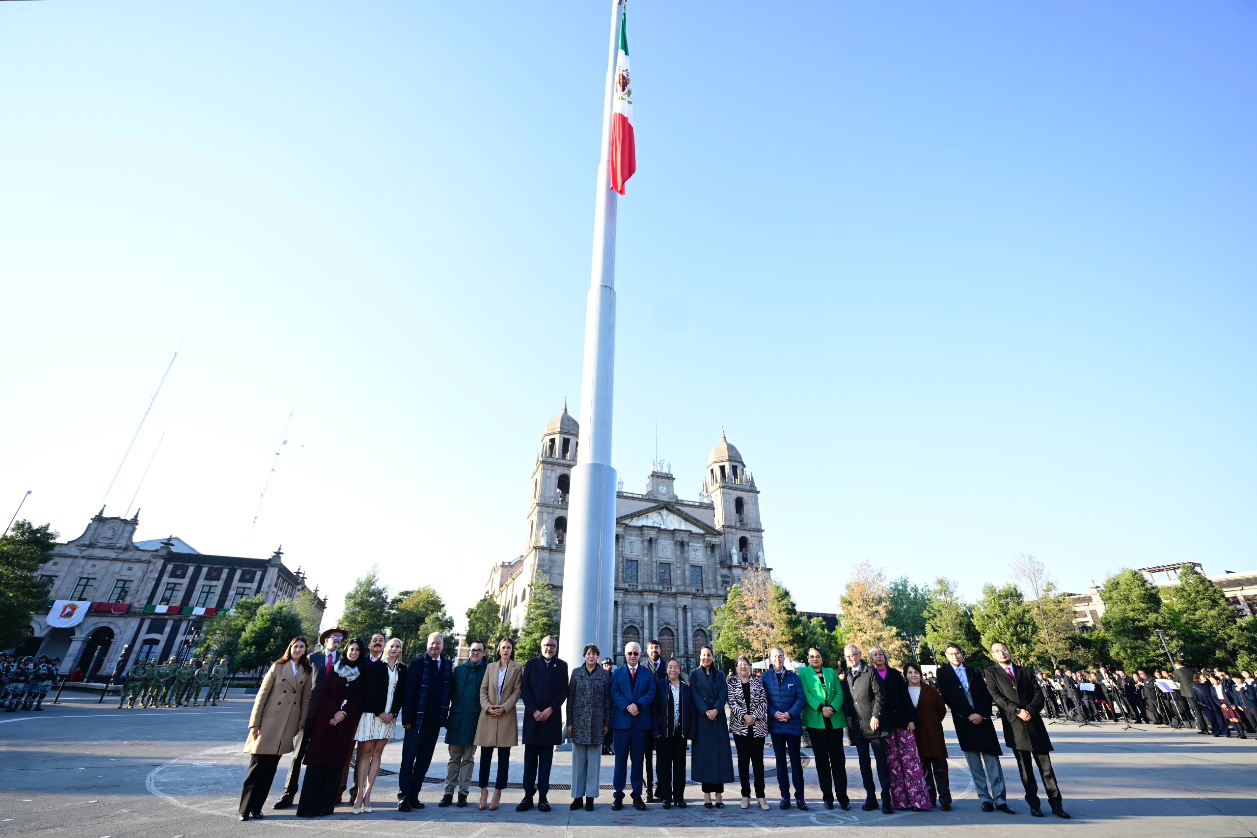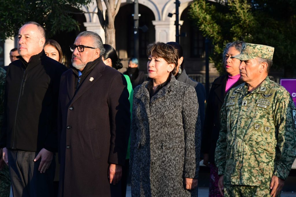 TOLUCA, Estado de México. – La Gobernadora del Estado de México, Delfina Gómez Álvarez, encabezó la ceremonia de izamiento y honores a la Bandera en la Plaza de los Mártires, en la ciudad de Toluca, acompañada por las y los integrantes de la Mesa de Coordinación para la Coordinación de la Paz y del Gabinete legal y ampliado.