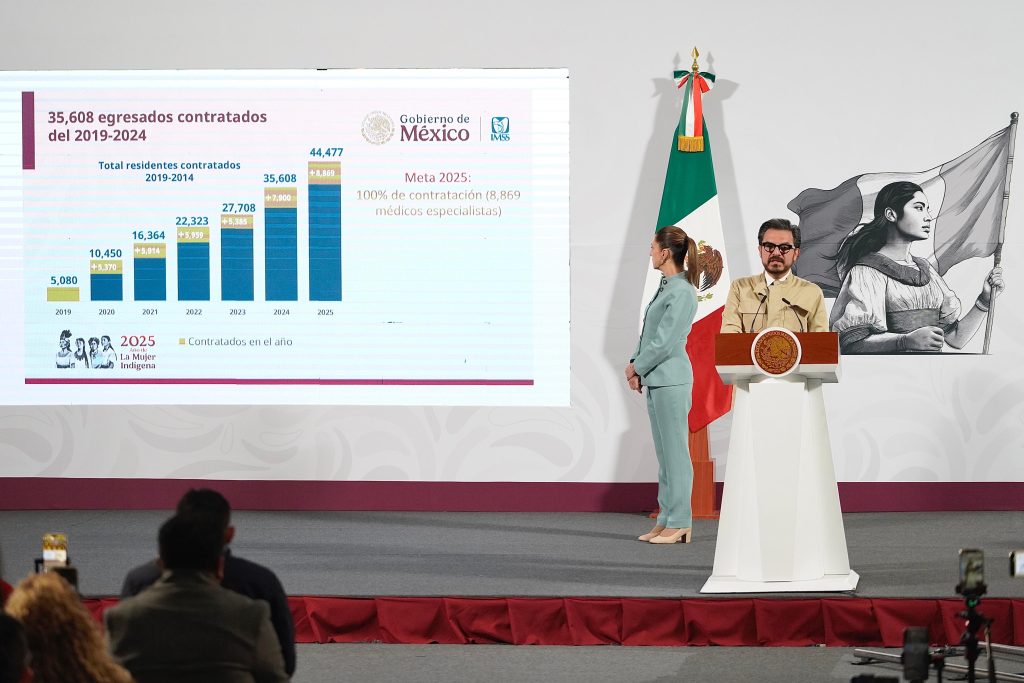 Detalló que en 2019, el Seguro Social contrató a 5 mil 080 egresados; en 2024 se emplearon a 7 mil 900, un incremento de 55 por ciento en materia de contratación de especialistas; en el acumulado de 2019 a 2024 ingresaron a las filas del Instituto 35 mil 608 residentes, la mayoría formados en el IMSS.
