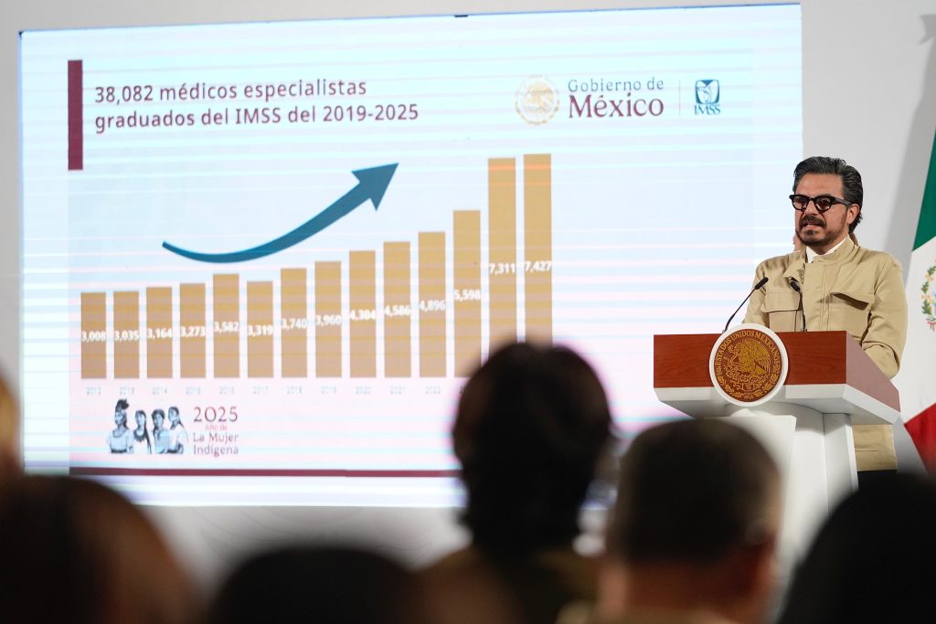 Refirió que 2019 a 2025, el incremento de residentes pasó de 15 mil a 26 mil en todos los años; se incrementó la contratación de médicas y médicos profesores, titulares y adjuntos para llegar a 5 mil 212; las sedes de formación pasaron de 200 a 389 al fortalecer este proceso en Hospitales de Generales Zona y de Sub-Zona, así como en Unidades de Medicina Familiar.
