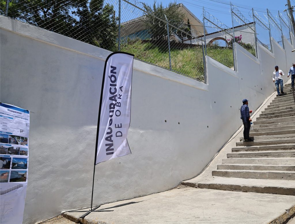 En este recorrido, también se llevó a cabo la entrega de la barda perimetral en la escuela Primaria “Estado de México”, que abarca 30.14 metros lineales y 45.21 metros cuadrados, ubicada en la colonia Montón Cuarteles, beneficia a mil 400 alumnos en los turnos matutino y vespertino, y sirve para delimitar las zonas de áreas verdes en los alrededores del plantel y, con ello, prevenir algún accidente.