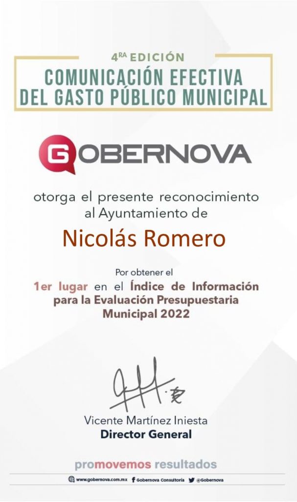 NICOLÁS ROMERO.- Este municipio gobernado por el alcalde Armando Navarrete López, fue refrendado como vanguardia y líder en el Estado de México, en el manejo correcto y transparente de los recursos públicos, por lo que por tercera ocasión consecutiva, la consultora Gobernova, reconoció a la administración local, con el primer lugar en el Índice de Información para la Evaluación Presupuestaria Municipal (IIEPM) 2022, debido a sus óptimos resultados en ese renglón.