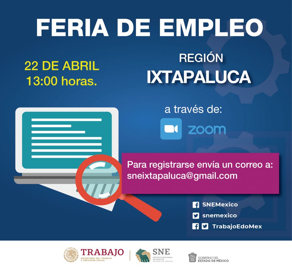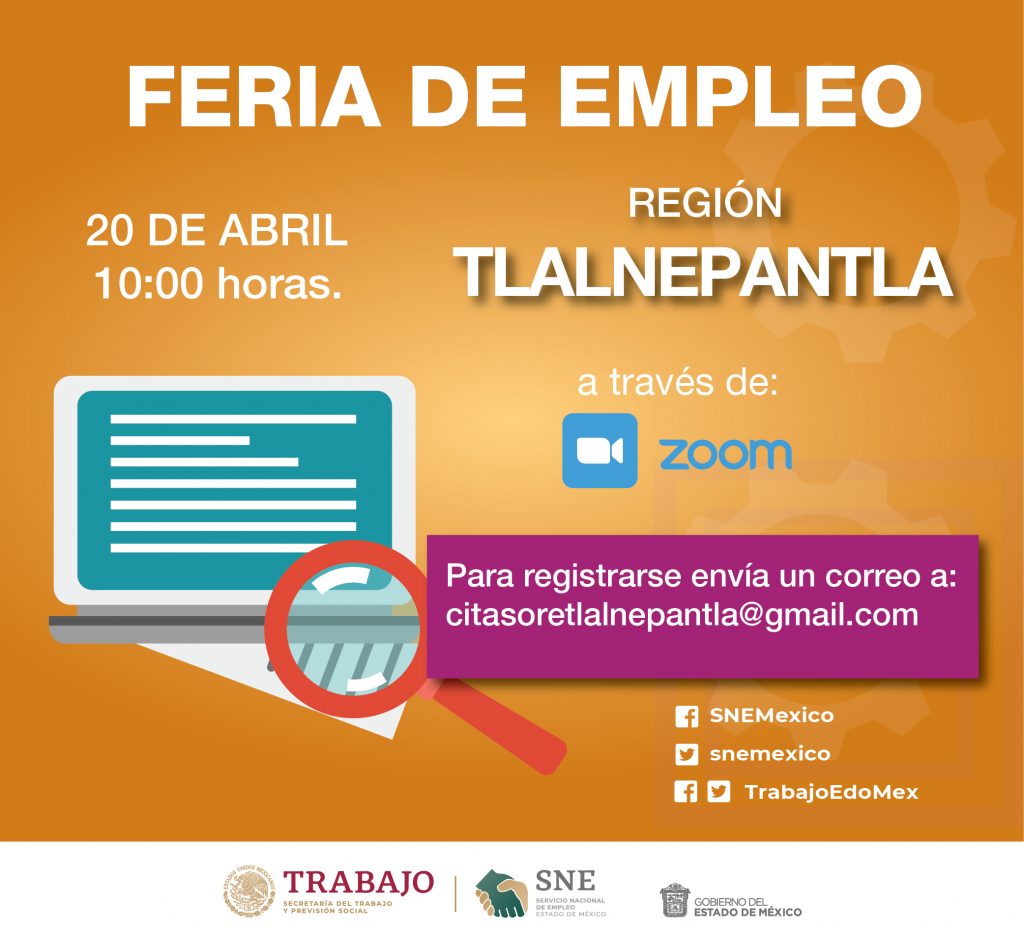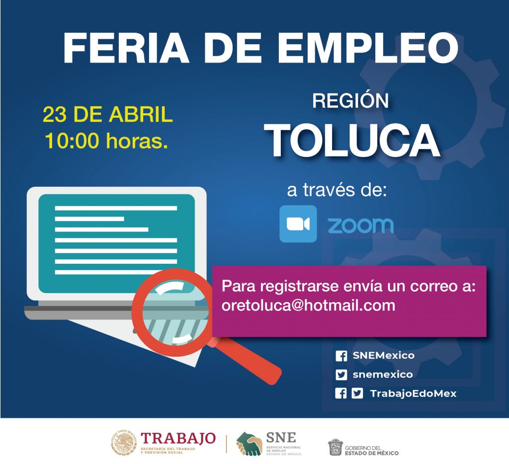 Toluca, Estado de México, 7 de abril de 2021.Con el propósito de vincular a los buscadores de empleo con las vacantes de trabajo que hay en cada región de la entidad, durante el mes de abril, la Dirección General de Empleo de la Secretaría del Trabajo del Estado de México realizará nueve Ferias Virtuales de Empleo.