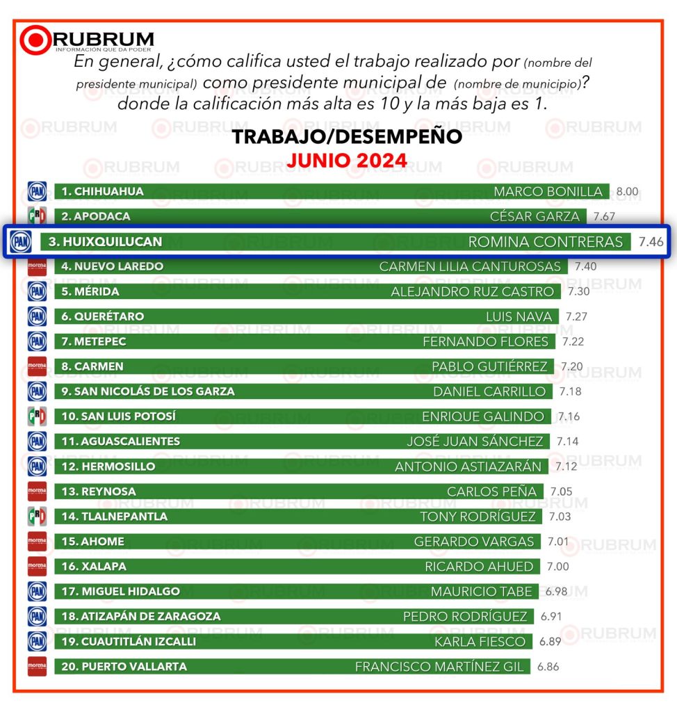 En la “Evaluación de Alcaldes” de esta casa encuestadora, correspondiente al mes de junio, Romina Contreras obtuvo una calificación de 7.46 en cuanto a desempeño, en una escala del 0 al 10; cifra que la posiciona en el primer lugar a nivel estatal y entre los primeros tres sitios a nivel nacional.