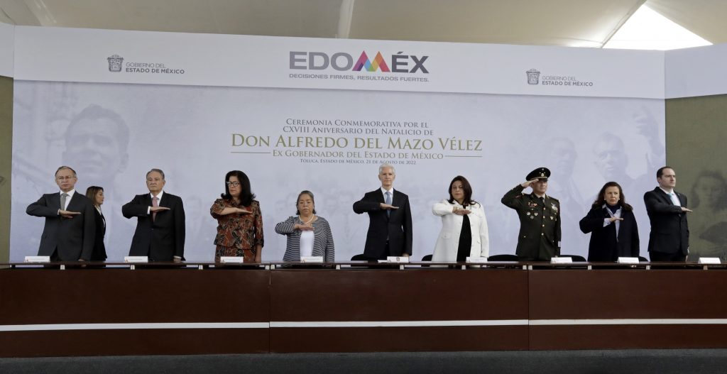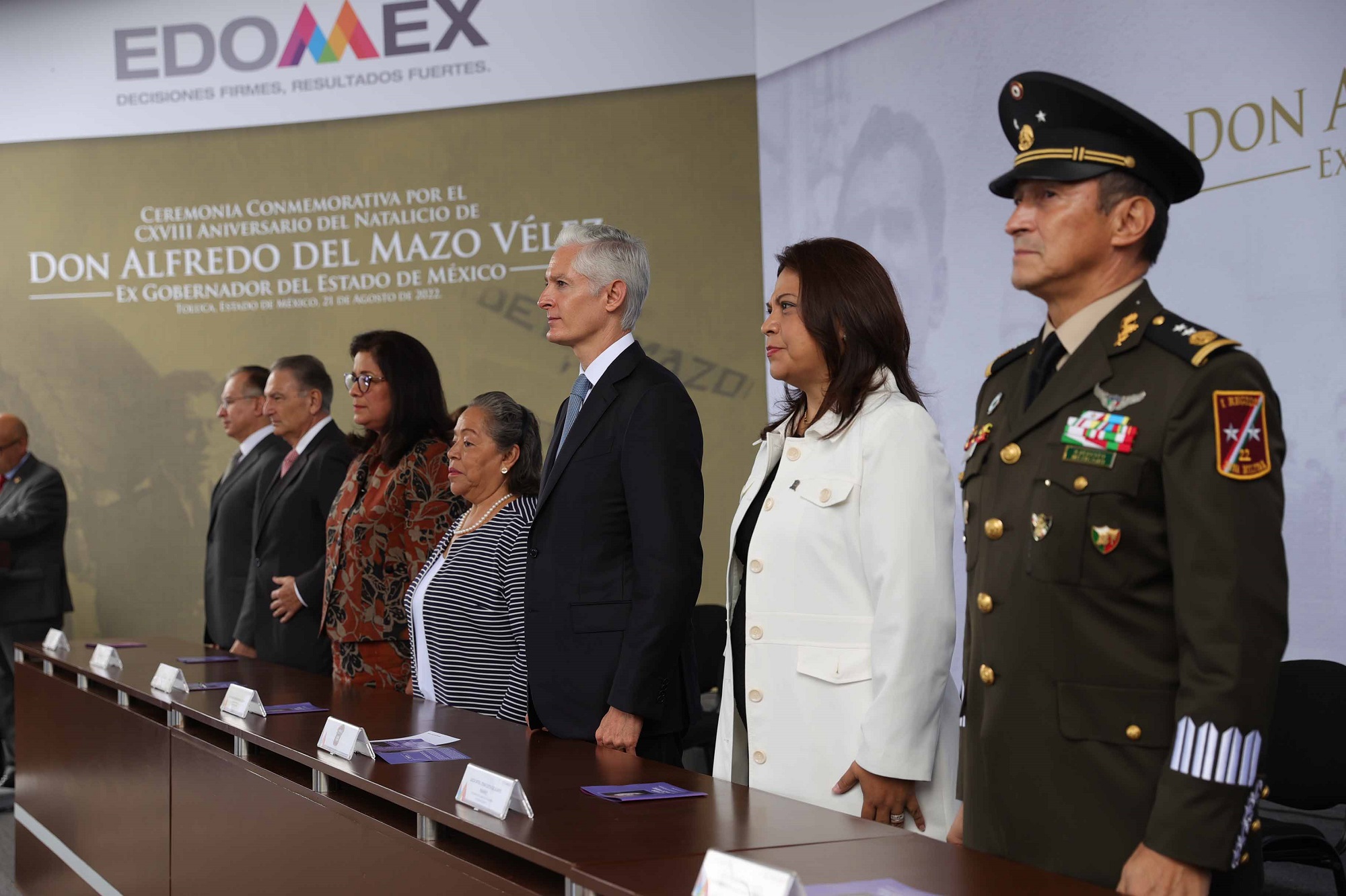 Previo al inicio del evento, el mandatario estatal encabezó una guardia solemne de honor al pie del monumento Don Alfredo Del Mazo Vélez, acompañado por los representantes de los Poderes Legislativo y Judicial, del Comandante de la 22ª Zona Militar, del Secretario General de Gobierno, del Alcalde de Toluca y de Susana Del Mazo González, hija del recordado.